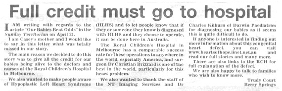 I AM writing with regards to the article “Our Babies Beat Odds” in the Sunday Territorian on April 21. I am Casey’s mother and I would like to say in this letter what was totally missed in our story.